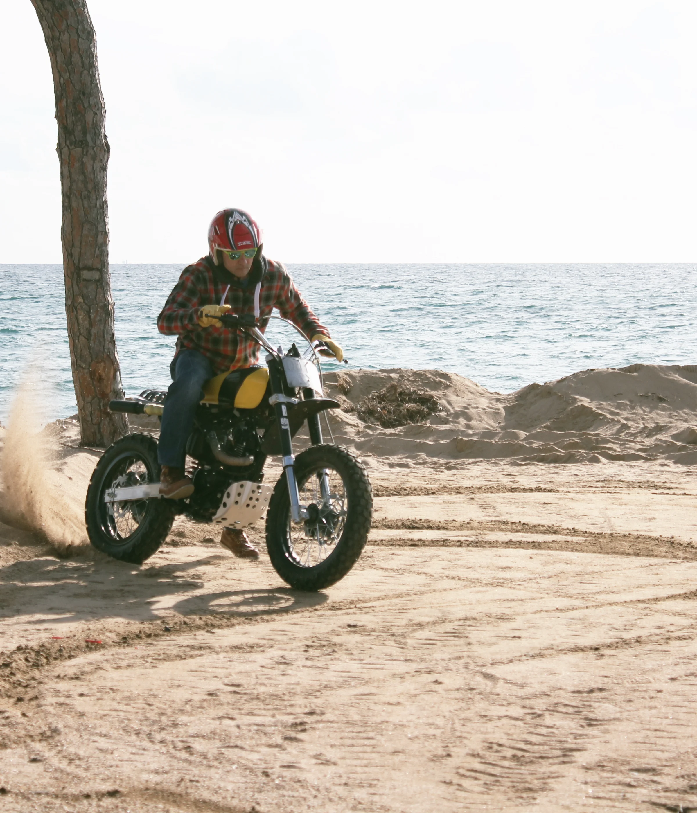 Nice weather has come in this winter weekend , so we "finished" this custom made rough tracker in a rush and take it out to make some ride with it. Pretty noisy and pretty comfortable instead of you might think with its steel bended saddle. Xavi says it handles perfectly and the tires give to him a lot of confident in corners, even in the very hard dry sand tracks.